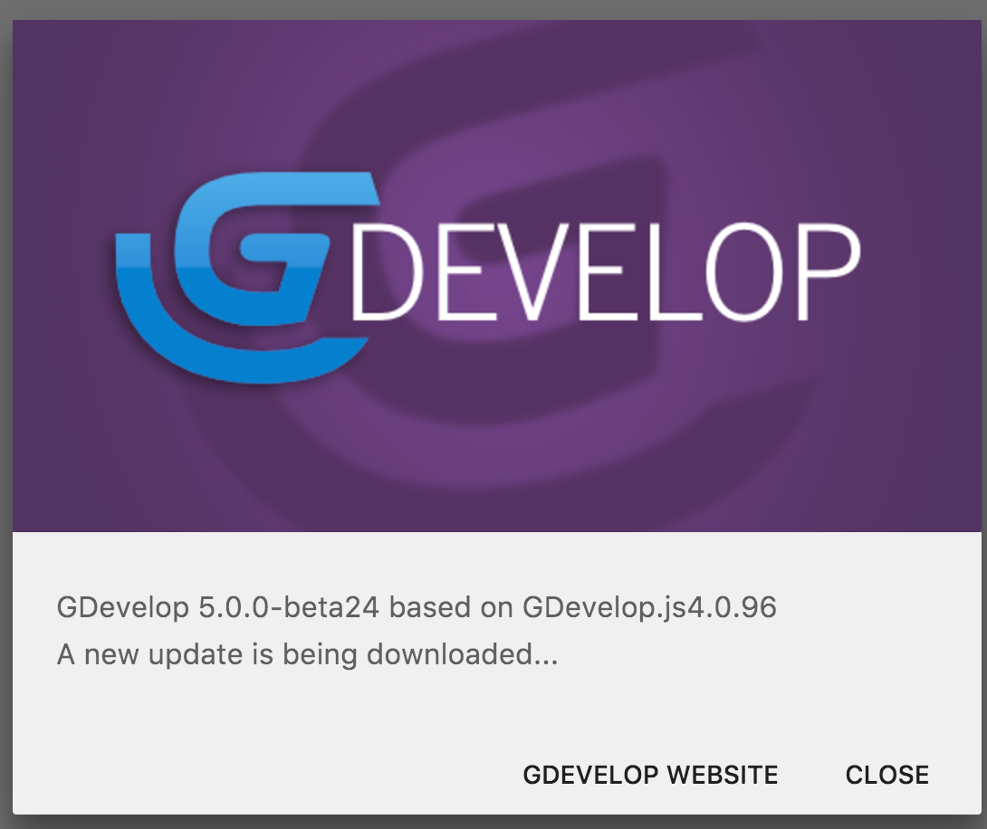 You can now close GDevelop and open it again: the new update will be installed. Check again the About window to see the version number updated.