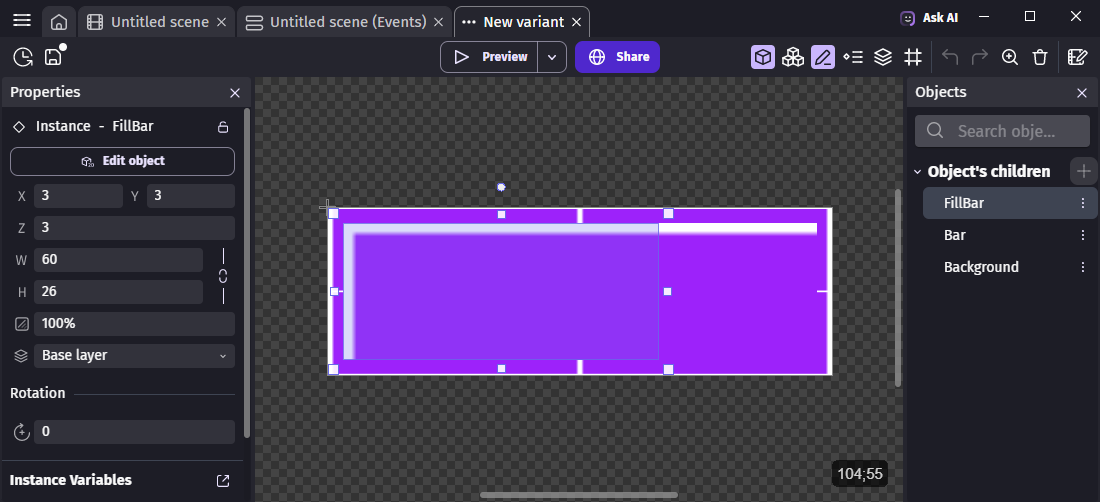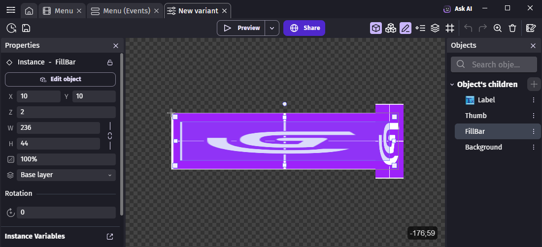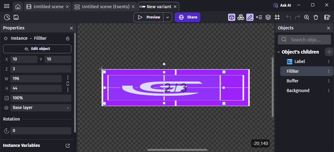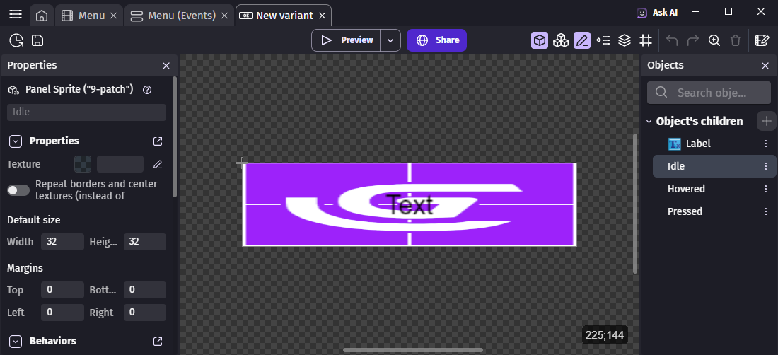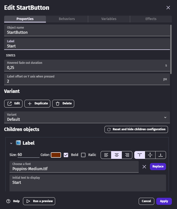 • Report your configuration on the Object's children on the left. For convenience, you may want to open your project backup in a second instance of GDevelop.