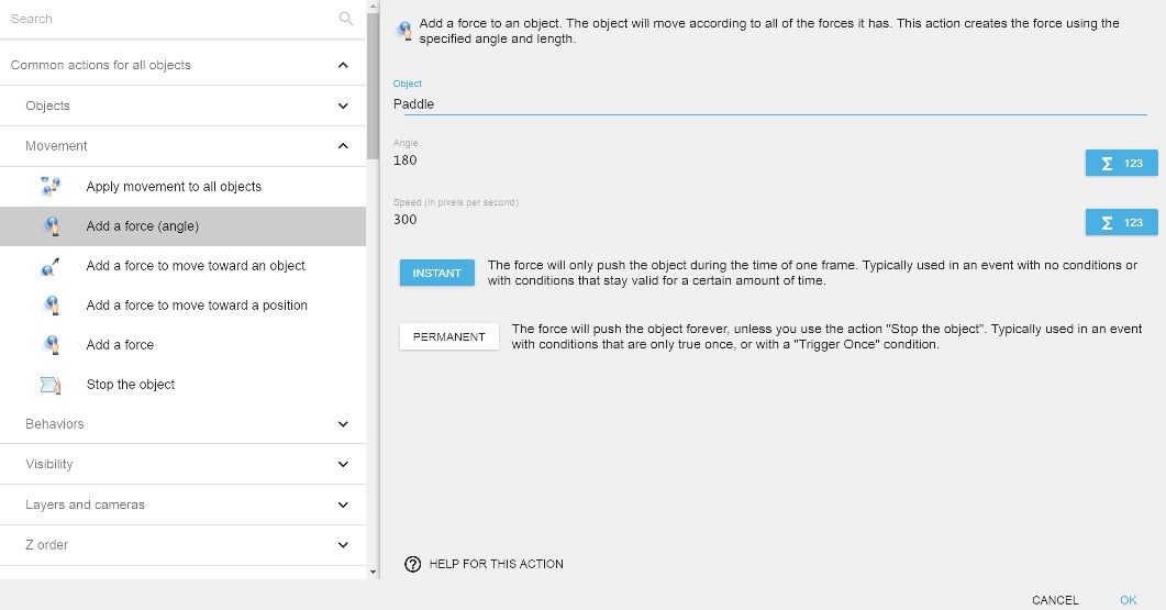 • Click Common actions for all objects > Movement > Add a force (angle).