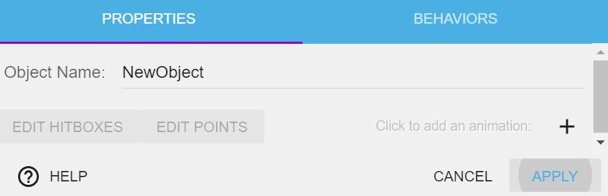 Upon clicking the "Sprite" option, a dialog box to change the properties of the Sprite object appears. We are now going to add animations for our character. To add your first animation, simply click on the Click to add an animation area or on the + button.