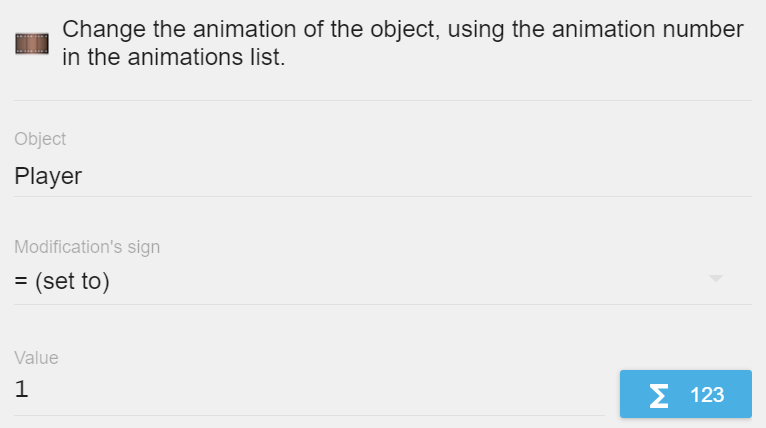 We also need to make the character play the Run animation when he is on floor. Since we have already made an event to check the "Is on floor" condition, we can simply add another action for this same event. Click Add an action->Sprites->Animation and images->Change the animation. Then fill in the object and the correct animation identifier to play that particular animation. For this game, we saved our Run animation at the identifier 2. You can also use the animation name as an identifier. To refer to animations using their name, you should use the Change the animation (by name) option instead. If you use a name, don't forget to put the name within quotes (") as it is a string.