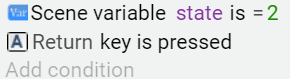 Hint: For the first condition, we need to check the value of the scene variable state. Click Add a condition→Variables→Value of a scene variable. Set it to check if the value is equal to 2. For the second condition, Add a condition->Keyboard->Key pressed, then set it to check for the Return key pressed. tip