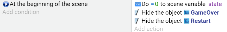 In other words, we want the game to start when the value of the scene variable state is 1. Let's modify our events.