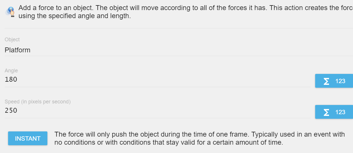 For our first action, click to "Add an action". Then find Common actions for all objects->Movement->Add a Force(Angle). Then choose Platform as the object and assign it an angle 180(specifying left direction) and a speed 250. You can test the action we just created by using the Play button to see a preview. You can see the obstacles moving towards the left. Notice that when the Player Sprite comes in contact with the Platform/Obstacle, it also moves(slides) towards the left. We don't want our character to move when he is on the floor of the platform. Our next event handles that.