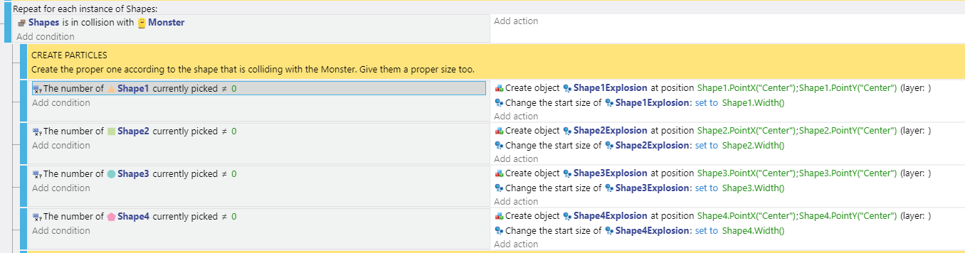Add a new action: "Shape1Explosion" in the list of objects, look for "Create and object", and then X position to Shape1.PointX("Center") and Y position to Shape1.PointY("Center"), so they spawn in the middle of the shape they are going to replace.
